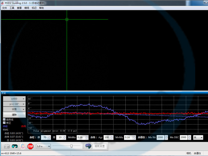 Der ALccd-QHY PoleMaster wurde an einer Skywatcher NEQ6-Montierung adaptiert, die Kalibrierung durchgeführt. Im direkten Anschluß wurde die automatische Guidingkorrektur in beiden Achsen unterbrochen um die Abweichung über einen Zeitraum von 10 Minuten aufzuzeichnen. Innerhalb von 30 Minuten beträgt die Abweichung in Deklination (hier der relevante Wert) lediglich 1,5" (in der Grafik die rote Linie). Umgerechnet bedeutet dies ein Aufstellungsfehler von max. 18". Dies ist für so ein kleines Tool ein wirklich beachtlicher und sehr guter Wert!