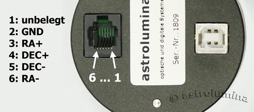 In den ALccd-QHY-Kameras sind sogenannte "Elektronische Relais" eingebaut. Die galvanische Trennung erfolgt durch einen Optokoppler vom Typ "TLP281". Dem Ausgangstransistor des Optokopplers ist ein Widerstand von 50 Ohm in Reihe geschaltet, so das auch der Betrieb mit einer Steuerung einer Losmandy G11 sichergestellt ist. Der nachfolgenden Grafik entnehmen sie die Pinbelegung der Autoguiderbuchse. Die "Schaltung" des entsprecheden Anschlußes erfolgt durch eine Verbindung mit "Masse".