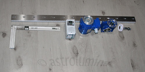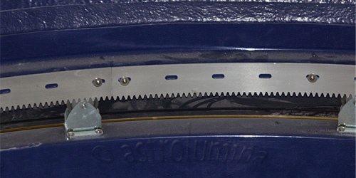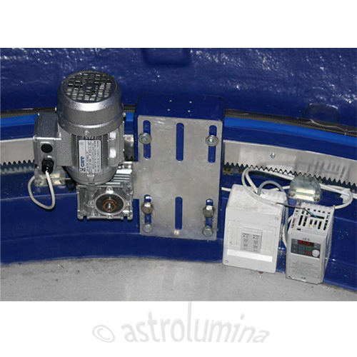 Bisher haben wir alle ScopeDome mit einem Reibrollenantrieb ausgeliefert. Seit November 2009 können wir Ihnen eine Neuerung anbieten, die durch einige Vorteile gegenüber dem Antrieb mit Rollen besticht - einen Zahnradantrieb mit einem Polyamid-Ritzel. Wir liefern aktuell nur noch mit dieser Antriebsmethode aus. Ältere Kuppeln (vor 11/2009) können ohne Probleme mit dem neuen Antrieb nachgerüstet werden. Durch die individuell anpassbaren Zahnprofile, können Sie auch diverse Kuppeln anderer Hersteller mit diesem Antrieb versehen.